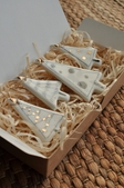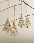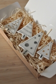 Набір із чотирьох різних різдвяних ялинок. Створені з білої глини, з підглазурним розписом олівцем, нанесені акценти золотом. Набір натхненний дитячими малюнками.